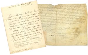 Emmanuel-Louis, marquis de Noailles : l.a.s., 1787, sujet diplomatique ; 3 lettres (dont 2 l.a.s.) à son notaire de Caux, 1806-1813 ; et dossier de 9 pièces concernant la vente au notaire De Caux de deux maisons à Paris et d’une propriété à Saint-Germain-en-Laye (1799) et sa radiation de la liste des émigrés (dont une p.s. par Le Brun, ministre des Affairés étrangères).