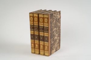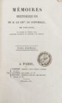 141-FONVIELLE. Mémoires historiques, de M. le Cher. de Fonvielle, de Toulouse, de l'ordre de l'éperon d'or, secrétaire perpétuel de l'académie des ignorants. A Paris, Chez Ponthieu, l'Auteur, Boucher, décembre 1824, 4 vol. in-8, demi-veau caramel, dos lisse orné, armes en tête, chiffre en pied (reliure de l'époque). Édition originale. "C'est en 1796 qu'il rédige l'essentiel de ses mémoires, les 3 premiers volumes. Le premier relate ses débuts sous l'Ancien Régime, les deux autres les péripéties de son existence pendant la Révolution. Ecrits avec une apparente sincérité et beaucoup de notions précises, ses souvenirs donnent une foule de renseignements sur l'histoire de cette époque en Provence et en Languedoc, notamment sur beaucoup de personnages de second plan." (Fierro). Fierro, 558 ; Tulard, 556. Bel exemplaire aux armes et au chiffre de Louis-Philippe d'Orléans. Cachet de la Bibliothèque du Roi au château d'Eu.
