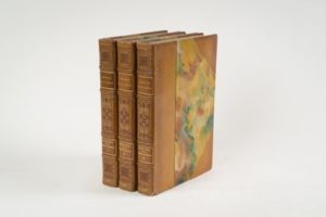 184-HORTENSE DE BEAUHARNAIS. Mémoires. Pub. par le prince Napoléon avec notes de Jean Hanoteau. Paris, Plon, 1927, 3 vol. in-8, XIX-369-391-400 pp., nbx portraits, 1 fac-similé, bibliographie, index, demi-maroquin chataigne à coins, dos à nerfs orné à froid, tête dorée, couverture et dos conservés (Saulnier). Edition originale. 1/200 exemplaires sur pur fil. Tulard, 707. "Ces mémoires de tout premier ordre sur Joséphine, les Tuileries, Louis Bonaparte en Hollande, l'exil, ont été écrits vers 1820. Leur authenticité est incontestable. On ne perdra pas de vue le but de ces mémoires : justifier Joséphine d'une part et Hortense de l'autre, dans ses déboires conjugaux avec Louis. L'appareil critique de Jean Hanoteau est remarquable." Bel exemplaire.