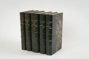 230-LOMENIE (Louis de). Les Mirabeau. Nouvelles études sur la société française au XVIIIe siècle. Paris, Dentu, 1879-1891, 5 vol. in-8, demi-maroquin vert à coins, dos à nerfs, tête dorée (David). Edition originale de ce monumental ouvrage, rare complet. Bon exemplaire. Petits frottements sur certains nerfs.