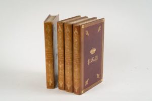 256-MERLIN (Maria de Las Mercedes, comtesse). Souvenirs et mémoires. Publiés par elle-même. Paris, Charpentier, 1836, 4 vol. in-8, maroquin prune à grain long, dos lisse orné en long, large bande de filets dorés en encadrement sur les plats, fleurons en écoinçon, fer doré dans les angles, monogramme P. F. de P. au centre des plats, tranches dorée, roulette intérieure, gardes de moire blanche à décor floral (Simier r. du Roi). Édition originale rare. Epouse du général Merlin qui s'illustra en Espagne, la comtesse Merlin, originaire de Cuba, laisse ici les "Souvenirs d'une créole" qui concernent tout particulièrement la cour d'Espagne sous le règne de Joseph. Exceptionnel exemplaire de Pierre IV F. de Portugal, Empereur du Brésil. Décédé en 1834, il est probable que son successeur ait maintenu son chiffre. Très fine reliure de Simier. Dos un peu passé.