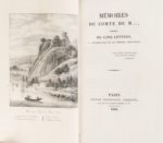 273-[MORE DE PONTGIBAUD (Charles-Albert de)]. Mémoires du Comte de M... précédés de cinq lettres, ou considérations sur les mémoires particuliers. Paris, Victor Thiercelin, [Imprimerie de H. Balzac], 1828, in-8, (4)-319 pp., frontispice, demi-maroquin rouge à coins, dos à nerfs, tête dorée, couverture et dos conservée (Canape). Édition originale de toute rareté de ces mémoires imprimés par Balzac. En frontispice, une lithographie par Engelmann montrant une vue du fort de Pierre Cise. Au verso du faux-titre, on trouve la mention Imprimerie de H. Balzac, rue des Marais, S.-G. n° 17. L'essentiel de ces mémoires porte sur la Guerre d'Indépendance des États-Unis. Personnage remuant, Moré se retrouve enfermé par sa famille à Saint-Lazare, puis par lettre de cachet, à Pierre-Encise, d'où il s'évade de manière rocambolesque en août 1776. C'est avec cet épisode que commence son récit. De là il part aux États-Unis où les circonstances l'amènent à se rapprocher de La Fayette dont il devient l'aide de camp. Lors d'un second voyage aux États-Unis, il participe aux côtés de Rochambeau à la bataille de Yorktown. C'est logiquement qu'il émigre au début de la Révolution et séjourne en Suisse et en Allemagne. Il retournera encore une fois aux États-Unis en 1799 pour être là aux côtés de Talleyrand. Le livre connut une diffusion très restreinte, publié seulement à une centaine d'exemplaires. L'introduction de la seconde édition de 1898 affirme qu'"aujourd'hui, un exemplaire des Mémoires du Comte de M. est à peu près introuvable dans le commerce". Les lettres qui suivent son récit sont du comte de Salaberry, son cousin. Fierro, 1190. Tulard, 1062. Inconnu à Sabin. Relié en tête une L.A.S. de 4 pages de Pontgibaud, petit neveu de l'auteur, datée du 17 septembre 1900, qui offre l'ouvrage en donnant de précieux renseignements sur l'histoire du livre : "La raison de cette rareté est bien simple : en 1828 mon grand-père était pair de France et craignit que beaucoup de personnages encore vivants... il rachète toute l'édition peu de jours après qu'elle eut paru. Quelques exemplaires seulement avaient été acheté. Mon grand-père les fit mettre au grenier où l'humidité, les rats, et les vers, en eurent finalement raison. J'en ai sauvé du naufrage ce que j'ai pu". Bel exemplaire.