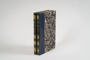 282-NODIER (Charles). Souvenirs, épisodes et portraits, pour servir à l'histoire de la Révolution et de l'Empire. Paris, Levavasseur, 1831, 2 vol. in-8, XXXVI-286-[2] pp. et 330-[2] pp., portrait, demi-maroquin bleu, dos à nerfs, armes répétées au dos, tête dorée (reliure postérieure). Edition originale. Mémoires composés par le célèbre littérateur romantique qui, de son aveu même, pensait qu'il n'y a rien de plus vulgaire que les faits, et rien sur quoi on s'accorde moins (préliminaires, page XII). Son propos n'est donc pas de relater l'histoire avec objectivité mais de mettre bout à bout des sensations. Le premier volume consacré à la Révolution s'intéresse à la Terreur, à Robespierre, aux émigrés en 1799 et à la réaction thermidorienne. Le second donne une bonne description des prisons de Paris sous le Consulat (il y fut incarcéré), des renseignements sur les complots de Fournier-Sarloveze et Malet et sur la franc-maçonnerie et le carbonarisme. Tulard, 1082. Bel exemplaire aux armes du Marquis Des Roys, avec son ex-libris. Dos légèrement passé.