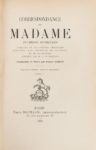 285-ORLÉANS (Duchesse d'). Correspondance de Madame, Duchesse d'Orléans, Extraite de ses lettres originales déposées aux archives de Hanovre et de ses lettres pub. par L.-W. Holland. Trad. et notes par Ernest Jaeglé. 2e éd., revue et augmentée. Paris, Bouillon, 1890, 2 vol. in-8, index, demi-maroquin vert à coins, dos à nerfs orné, tête dorée (reliure de l'époque). Correspondance de 1670 à 1716. Bel exemplaire.