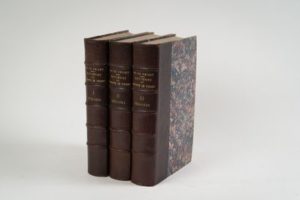 317-REISET (Lieutenant Général Vicomte de). Souvenirs, 1775-1836. Pub. par son petit-fils le vicomte de Reiset. Paris, Calmann-Lévy, 1899-1901, 3 vol. in-8, frontispices, demi-maroquin parme, dos à nerfs, couverture conservée (reliure de l'époque). Édition originale. Tulard, 1226 : "On trouve dans ces fragments de lettres et de journaux intimes beaucoup de détails curieux sur la cour, les cérémonies et certaines campagnes (Iéna, Eylau, l'Espagne)". "Après avoir bien servi l'Empire, Reiset se rallie avec plaisir aux Bourbons et les suit à Gand pendant les Cent-Jours. Officier supérieur à la Maison militaire du roi, il décrit abondamment la vie à la cour, brosse de nombreux portraits et donne quelques indications sur la vie politique. De 1823 à 1828, il commande le corps expéditionnaire français en Catalogne. Très bref sur la chute de Charles X, il décrit cependant sa route vers Cherbourg et l'exil." (Bertier, 857). Bel exemplaire enrichi de 16 portraits et gravures ayant trait à la famille de Reiset (Tome 1).
