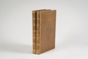 474. DEMOUSTIER (Charles-Albert). Lettres à Emilie sur la mythologie. Pari, chez L. Tenné, 1820, 2 volumes in-8, 288 pp. et 288 pp., 6 gravures, veau marron glacé, dos lisse orné de filets dorés et de fleurons à froid, roulette à froid en encadrement sur les plats, grand fer à froid sur les plats, tranches marbrées (reliure de l'époque). Ex-libris Harcourt. Dos un peu piqué, rousseurs, coins usés.