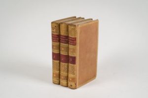 499. ELPHINSTONE (Mountstuart). Tableau du royaume de Caboul, et de ses dépendances dans la Perse, la Tartarie et l'Inde. Traduit et abrégé de l'anglais. Paris, Neveu, 1817, 3 volumes in-16, XLIV-189-(2) pp., 222-(1) pp. et 223-(1) pp., 14 gravures en noir, veau blond, dos lisse orné, roulette dorée en encadrement sur les plats, tranches dorées (reliure de l'époque). Un des titres peu communs de la célèbre collection Neveu sur les voyages. Très bon exemplaire. Infimes travaux de ver à la reliure.