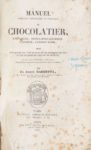 513. [GASTRONOMIE] - BARRETTA (Charles-Joseph). Manuel complet, théorique et pratique, du chocolatier, limonadier, distillateur-liquoriste, confiseur, pâtissier suisse, suivi d'un traité sur l'art de faire et de conserver les vins et les vinaigres de table et de toilette. Ouvrage orné de 8 planches en taille-douce, et d'un tableau comparatif de degrés d'alcool en degrés centésimaux. Paris, Mathias, Lyon, Ch. Savy jeune, 1841, fort vol. in-8, titre, IV-814 pp., avec 8 planches hors texte "in fine", broché sous couverture factice de papier noisette, étiquette de titre sur la première couverture. Unique édition, très rare. Le dernier chapitre est exclusivement consacré à l'art de faire le vin avec, entre autres, des recettes pour les conserver et les rétablir. Rousseurs.
