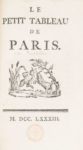 665. [RULHIERE (Claude-Carloman de)]. Le Petit tableau de Paris. S.l., 1783, in-12, 94 pp., demi-veau tabac, dos à nerfs orné, tranches marbrées (reliure à l'imitation). Édition originale peu commune. L'ouvrage passe en revue les différents lieux de la capitale en y associant des anecdotes. Très curieux bois gravé sur la page de titre montrant un faune et un bouc s'affrontant. Mention manuscrite Bibliothèque de M. Victor Touché, vente du lundi 4 juin 1866. Ex-libris Pierre Kohl (cachet) et ex-libris à l'encre rouge sur la page de titre (cachet).
