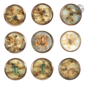 Parmi ces neuf boutons, deux comportent un petit coléoptère vert, un autre un papillon, deux des coquillages et quatre des végétaux.