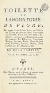 Nouvelle édition de ce recueil de recettes cosmétiques à base de plantes, divisé en deux parties. La Toilette de Flore donne la composition de nombreuses essences, pommades, poudres, fards et eaux de senteur, ainsi que des recettes de détachant. Le Laboratoire de Flore est consacré aux liqueurs, ratafias, huiles, eaux cosmétiques et officinales, etc. Natif de Metz, Pierre-Joseph Buc’hoz (1731-1807) renonça à une carrière juridique pour étudier la médecine à Nancy, où il entra au service du roi Stanislas. Passionné de botanique, il publia de nombreux ouvrages d’histoire naturelle, dont une Histoire des plantes de la Lorraine et une Histoire naturelle du règne végétal qui lui valut l’approbation de l’Académie royale des sciences. Cet ouvrage est, avec le Traité des Odeurs de Dejean, le seul du XVIIIe entièrement consacré à la parfumerie et aux cosmétiques que cite Wiggishoff dans son Essai de bibliographie des parfums et des cosmétiques. C’est également le seul livre relatif à ce sujet que décrivent les Goncourt dans leur propre collection (cf. La Maison d’un artiste, I, p. 334). Très bel exemplaire en maroquin signé Belz-Niedrée.