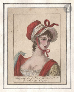 Recueil de 8 coiffures de la fin du XVIIIe siècle gravées et coloriées à l’époque : coeffure à l’Archipel, coeffure en cheveux à l’Athénienne, turban asiatique à bandeau, chapeau surmonté d’un voile de dentelle, coeffure à l’enfant surmontée de fleurs, cornette de tulle brodé, chapeau à la Pallas, chapeau de satin retroussé et bordé en cigne. Elles proviennent probablement d’un petit almanach de la fin du XVIIIe siècle. Chaque gravure de format 95 x 68 mm a été contrecollée sur deux feuillets de papier vergé et encadrée d’un double filet noir à l’encre. Bel exemplaire en reliure moderne.