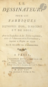 JOUBERT DE L’HIBERDERIE (Antoine-Nicolas). — Le Dessinateur, pour les fabriques d’étoffes d’or, d’argent et de — soie, avec la traduction de six tables raisonnées tirées de l’Abecedario pittorico imprimé à Naples en 1733. — Paris...