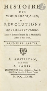 - MOLÉ (Guillaume). Histoire des modes françaises, ou Révolutions du costume en France, Depuis l’établissement de la Monarchie jusqu’à nos jours. Amsterdam, Paris : Merigot jeune, 1777. 2 parties en un volume in-12, 167 x 92 : (1 f.), xxiv, 205 pp., (2 ff.), pp. (207)-362 mal chiffrées 360.