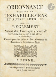Très rare ordonnance prohibant le luxe vestimentaire et autres exubérances. Cette ordonnance prise par le conseil de Berne réglemente l’usage des pierres précieuses, des étoffes d’or et d’argent, du velours, des broderies, des dentelles, mais également les deuils, les compérages, les danses, les mascarades et déguisements, les jeux, etc. Elle est suivie d’un règlement relatif aux domestiques, qui semblaient prendre un peu trop de libertés aux yeux des législateurs bernois.
