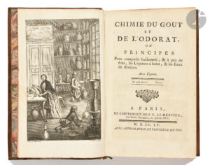 [PONCELET (Polycarpe)]. — Chimie du goût et de l’odorat, ou principes Pour composer facilement, & à peu de frais, les Liqueurs à boire, & les Eaux de senteurs. — Paris : imprimerie de P. G. Lemercier, 1755. — In-8, 174 x 108 : frontispice,...