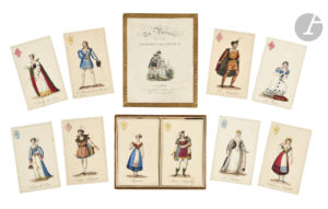 Chaque personnage est gravé et finement aquarellé en couleurs à la main. Le feuillet in-8 replié comporte la description de la composition des cartes ainsi que la règle du jeu.