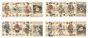 [CARTES À JOUER]. — [SUISSE]. — Jeu de 52 cartes à jouer anciennes. — S.l. fin XIXe siècle. — 52 cartes, 89 x 59, dos de papier au motif de pointillé bleu, tranches dorées, étui.