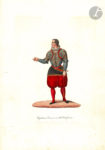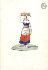 Les planches, non signées, sont légendées à la mine de plomb en italien et en français, à l’exception de 7 gravures dont la légende italienne est imprimée. Ces costumes semblent inspirés de deux suites publiées à Rome par Salvatore Marroni (1790-1872), au milieu du XIXe siècle, sous les titres de Nuova Raccolta di N° 40 costumi popolari di Roma (30 planches) et Raccolta dei principali Costumi Religiosi e Militari della corte Pontificia (40 planches).