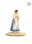 Recueil unique de 65 ravissantes aquarelles originales et 13 gravures aquarellées, aux coloris très frais. Ils représentent les costumes des environs de Rome et de la cour papale.