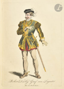 Bel album composé d’un titre gravé et de 24 planches gravées et coloriées à l’époque, représentant les costumes des personnages de la tragédie Marie Stuart de Friedrich von Schiller (1759-1805).