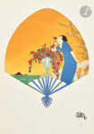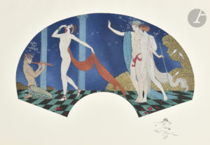 BARBIER (George) - IRIBE (Paul) - LEPAPE (Georges). — L’Éventail et la fourrure chez Paquin. — Paris, 1911. — Album in-folio, 483 x 345 : (8 ff. 2 premiers, 5e et 2 derniers blancs), 7 planches.