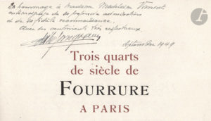 Cette plaquette fut éditée à l’occasion du 75e anniversaire de la Maison Jungmann et compagnie, par les soins de l’imprimeur-éditeur publiciste Alfred Tolmer. Elle présente quelques animaux à fourrures et retrace les 75 années passées, aux travers de la vie de la maison de fourrures et de celle de la vie à Paris, et revient sur quelques-unes des plus belles publications de la maison. Elle est illustrée de nombreuses reproductions et comprend en pages de garde une double page gaufrée de nombreux animaux à fourrures. Exemplaire de la grande couturière française Madeleine Vionnet, portant le n°10, enrichi de cet envoi autographe signé par Achille Jungmann :