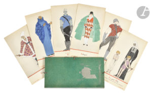 Très rare album préfacé sur deux feuillets par Henry Bidou. Il comprend 21 compositions de Georges LEPAPE (1887-1971), reproduites en phototypie par L. Deley et coloriées au pochoir par Jean Saudé, soit un titre, un décor et 9 costumes pour Le Coup manqué, ballet-pantomime de Rip, représenté pour la première fois au Théâtre de l’Athénée le 25 novembre 1915, et 2 décors et 8 costumes pour L’Enfantement du Mort, miracle composé par Marcel L’Herbier, représenté pour la première fois au Théâtre Édouard VII le 11 avril 1919.