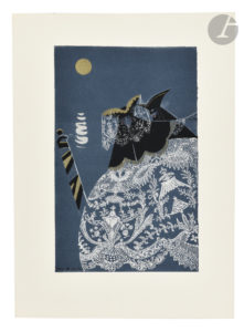 RÉGNIER (Henri de) - DYL (Yan-Bernard). — Le Miracle du fil. — Paris : Simon Kra, [1927]. — In-folio, 424 x 307 : (35 ff.), couverture illustrée. En feuilles, chemise à rabats en demi-toile dorée à bande, avec étiquette de titre.