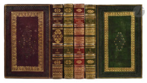 Cuir-de-Russie violet, vert ou rouge selon le volume, large encadrement de filets et roulettes dorés et à froid sur les plats, grand fleuron à froid relevé de pastilles dorés au centre, dos à 4 nerfs orné dans le même goût, roulette intérieure, tranches dorées (reliure de l’époque).