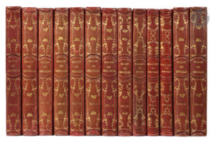 Demi-veau bleu glacé aux fers romantiques (5 volumes), puis demi-chagrin rouge à coins (23 volumes), dos lisse ornés de fers romantiques dont 19 avec le même décor, puis 4 volumes en demi-basane verte, dos lisse à faux nerfs dorés (reliures de l’époque).