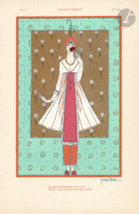 Colas, Bibliographie générale du costume et de la mode, I, 761-763. Collection complète des 7 albums parus entre 1912 à 1922 de cette luxueuse revue de luxe art déco sur la mode publiée par l’écrivain Pierre Corrard. Chaque volume réunit un écrivain et un artiste.