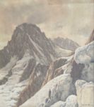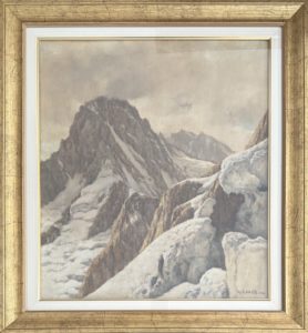 1944. Huile sur toile, 59 x 48 cm, signée et datée en bas à droite, encadrée avec un verre de protection. Très belle vue de haute montagne par le peintre Angelo Abrate (Turin 1900 - Sallanches 1985). Autodidacte inspiré par Cesare Maggi, il peint sur le motif des paysages de montagne, aussi bien l'été que l'hiver. Il fuit le régime fasciste en 1933 et s'installe à Sallanches. Cette toile a été peinte pendant l'occupation allemande de la zone libre, où Abrate avait dû regagner l'Italie, non sans faire de nombreuses excursions en haute montagne. Il retrouve Sallanches, sa ville d'adoption, après la fin de la guerre. Le massif du Mont-Blanc et ses environs, tant sur le versant français que sur le versant italien, sont ses principales sources d'inspiration.
