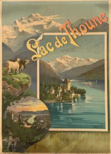 Paris, A. Bellier & Cie, vers 1895. Affiche lithographiée en couleurs, 105 x 73 cm, entoilée. La vue représente le lac de Thoune, avec le château de Spiez et la Jungfrau en arrière-plan. La première version a été publiée dans les ateliers d'Hugo d'Alesi en 1893, avant d'être reprise pour la compagnie du PLM vers 1895. État A-.
