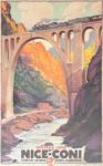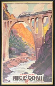 Paris, Lucien Serre & Cie, 1929. Affiche lithographiée en couleurs, 100,5 x 62,5 cm, encadrée, plexiglas de protection. Belle vue du Pont de Scarassoui, entre Fontan et Saorge dans la vallée de la Roya. Affiche exécutée pour la compagnie PLM. État : A+.