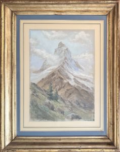 Vers 1950. Pastel signé en bas à gauche, 48 x 34,5 cm, encadré. Belle vue du Cervin. Victor Coverley-Price (Winchester, 1901 - 1988) était un diplomate, artiste et auteur britannique. Il était aussi un montagnard accompli. Il a obtenu une maîtrise d'art à l'Université d'Oxford. Il servit la diplomatie britannique jusqu'au lendemain de la seconde guerre mondiale, avant de se consacrer à l'écriture d'ouvrages illustrés, à la peinture et aux voyages. On lui doit des représentations de nombreuses montagnes du monde, des Andes au Kilimandjaro. Il a été un des peintres officiels des jeux olympiques de Londres en 1948.