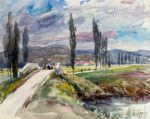 1923 - 1938. Trois aquarelles originales, 22 x 29 cm, 16 x 20 cm et 15 x 19 cm, en feuille et sous passe-partout. La vue des environs de Crémieu est sous la neige, signée an bas à gauche et désigné en bas à droite (sans date, vers 1930). La vue du pont, remarquablement exécutée, sous passe-partout, est signée et datée en bas à droite (1923). La vue du village est signée (initiales) et datée en bas à gauche (1938).