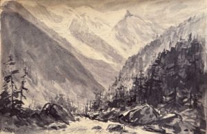 1925. Lavis d'encre, 22 x 34 cm, en feuille. La vue est prise depuis la sortie de Chamonix, avec la vue sur le glacier des Bossons, le mont-Blanc et l'aiguille du Goûter.