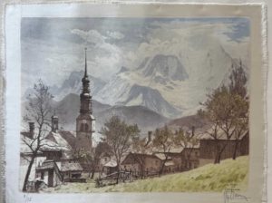 1950. Eau-forte sur satin en couleurs, 27,1 x 36,4 cm, en feuille. Superbe eau-forte représentant le clocher de l'église de Combloux avec le Mont-Blanc. Rarissime épreuve sur satin (n°1)