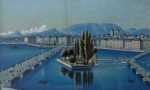 - DIKENMANN (Rudolf) : Le château de Chillon, aquatinte aquarellée de 8 x 4,8 cm (avec le train).