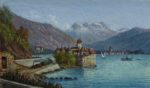 - DIKENMANN (Rudolf) : Château de Chillon vers les dents du Midi. Zurich, chez l'auteur, vers 1860. Aquatinte finement aquarellée et gommée, 10,8 x 7 cm. Superbe vue du château de Chillon et des dents du Midi.
