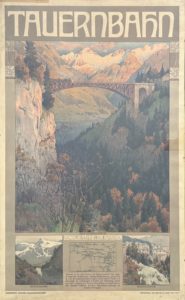 K. K. Hof und Staatsdruckerei, Vienne, 1908. Affiche lithographiée en couleurs, 100 x 70 cm, encadrée sous plexiglas. L'affiche représente le pont du chemin de fer des Tauern sur l'Angertal, près de Bad Hofgastein dans la vallée de Gastein (Autriche). Dans la partie inférieure de l'affiche figure une vue du col de Nassfeld dans les Alpes Carniques et une vue de Badgastein, station autrichienne à la mode dès le début du XXe siècle, ainsi qu'un plan schématique du réseau des chemins de fer autrichiens. État : A-.