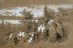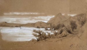 1854. Deux dessins à la mine de graphite avec rehauts de craie blanche, sur papier ocre, 12 x 21 cm et 13,5 x 21 cm, en feuilles. Un des deux dessins est signé en bas à droite.