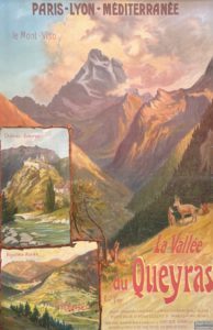 Paris, Ateliers d'Hugo d'Alesi, vers 1900. Affiche lithographiée en couleurs, 77 x 106 cm, entoilée. Affiche réalisée par la Compagnie PLM. La vue représente la vallée du Guil dominée par le Mont Viso, avec en incrustation une vue de Château-Queyras et une autre des villages d'Aiguilles et d'Abriès. État B (petits défauts en marge restaurés mais visibles, longue déchirure longitudinale au milieu, sans manque, peu visible).