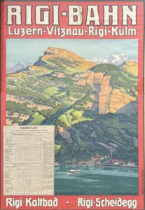 Berne, Hubacher & Co, 1912. Affiche lithographiée en couleurs, 90 x 64 cm, encadrée. L'affiche représente le lac des Quatre-Cantons dominé par le Rigi-Kulm. Cette affiche a été imprimée annuellement avec l'encart des horaires des trains du Rigi pour la saison en cours. État : B (déchirure réparée en partie haute, mais visible). Une version pour la saison hivernale existe, dessinée par Anton Reckziegel.