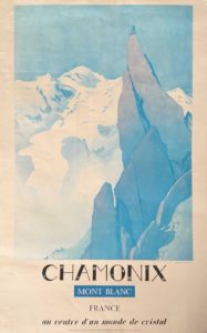 Chamonix, Office du tourisme de Chamonix, 1972. Affiche imprimée en quadrichromie, 99 x 63 cm, encadrée (cadre sommaire). La vue représente le Mont-Blanc avec le clocher de Planpraz en premier plan. É�tat : A-