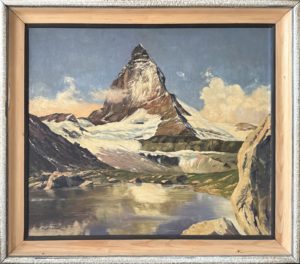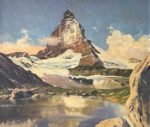 Vers 1920. Huile sur toile, signée en bas à gauche, 73,5 x 62,5 cm, encadrée. Belle et grande vue du Cervin se reflétant dans le lac Noir à Zermatt. Une composition classique par un peintre inconnu, mais visiblement bien inspiré, nous donnant un Cervin que n'auraient pas renié Charles-Henri Contencin ou Edward Theodore Compton.
