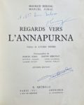 - HERZOG (Maurice) : Regards vers l'Annapurna. In-4°. Grenoble, Arthaud, coll. Belles pages, belles couleurs, 1951. In-4°, broché, couverture illustrée. Édition originale, illustrée de nombreuses photographies en noir et en couleurs hors-texte, la plupart par Marcel Ichac. L'album de photos de l'expédition française victorieuse à l'Annapurna. Exemplaire d'hommage de l'éditeur, signé sur la page de titre par Lionel Terray et Louis Lachenal.