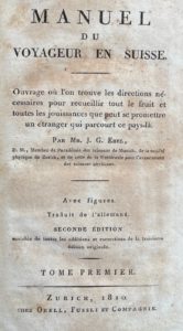Les éditions antérieures à 1815 sont rares. La première édition française a été publiée en un volume en 1795 sous le titre Instructions pour un voyageur qui se propose de parcourir la Suisse de la manière la plus utile et la plus propre à lui procurer toutes les jouissances dont cette contrée abonde ; la seconde a été publiée en 1805 en 4 volumes, la première sous le titre Manuel du voyageur en Suisse, ce qui justifie la mention Deuxième édition figurant sur celle de 1810-1811.