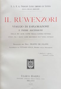 Milan, Hoepli, 1908. Grand in-8°, reliure pleine toile de l'éditeur. Charnières renforcées. Édition originale, Superbement illustré par Vittorio Sella de 168 photographies dans le texte, 24 héliogravures hors-texte, 5 panoramas dépliants et 7 cartes dépliantes. Frontispice en couleurs par A. Fitegerald. Récit de l'expédition du Duc des Abbruzzes en Afrique tropicale, avec la première ascension du Ruwenzori et de plusieurs autres sommets de la région en 1906.